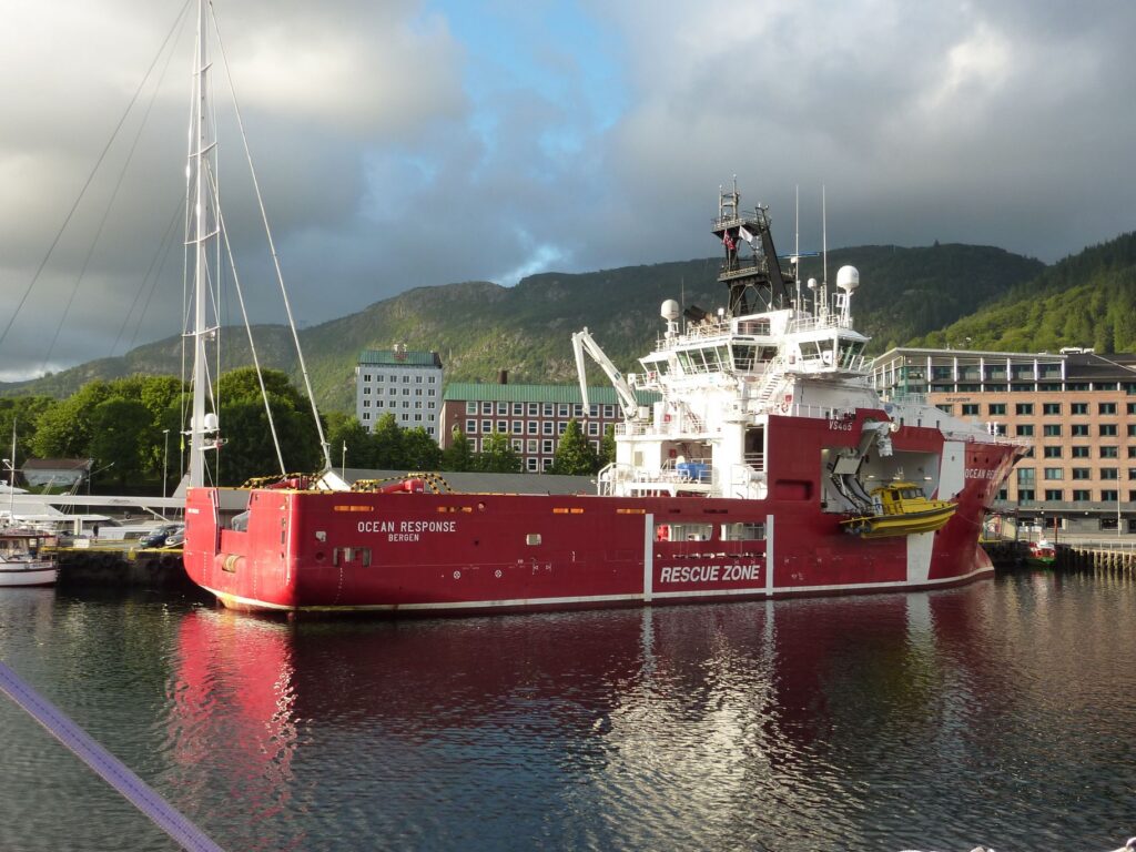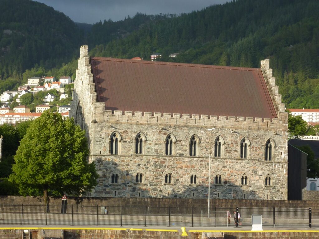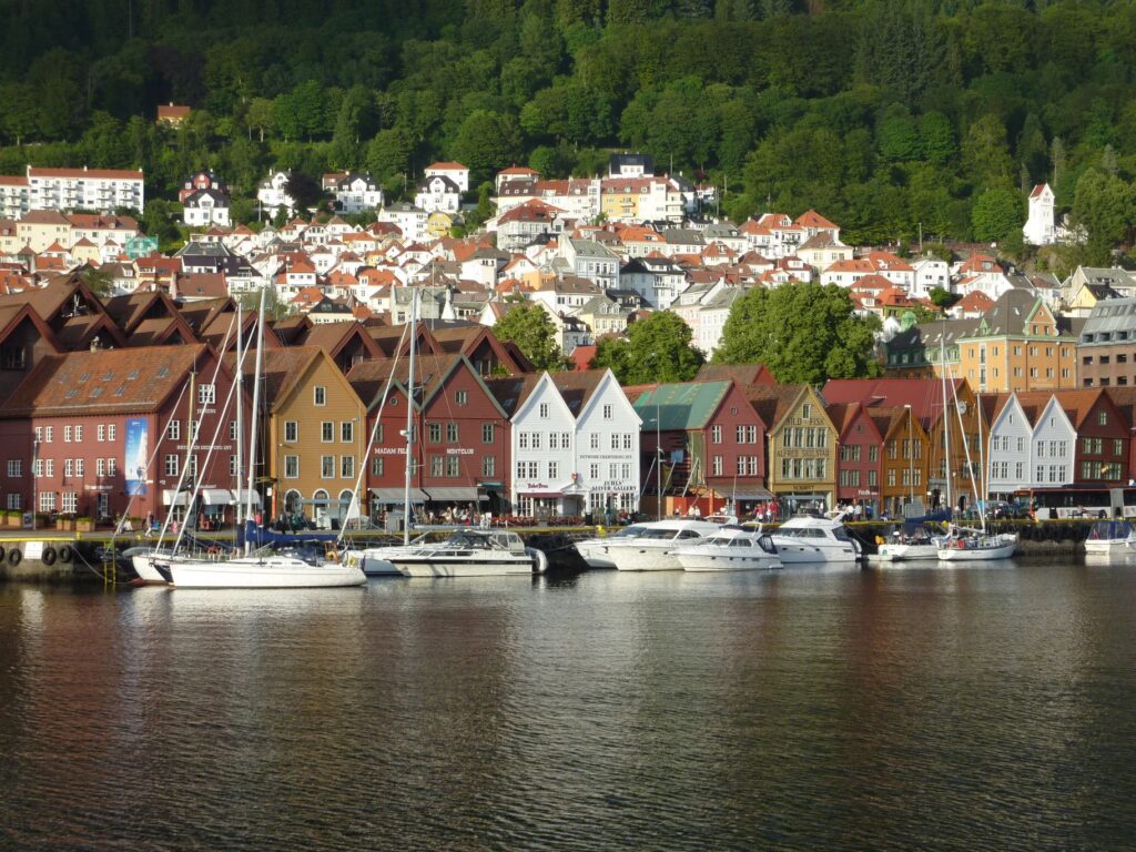Dann verändert sich die Landschaft, wir sind aus dem Fjord raus und kommen an die Küste. Das Expressboot ist offensichtlich nicht für das offene Meer gemacht und so geht es zwischen den Inseln durch. Hier ist die Geschwindigkeit noch besser zu sehen, als auf dem weiten Fjord. Nur an wenigen Engstellen muss der Steuermann die Geschwindigkeit reduzieren. Hinter uns fährt ein Boot gleicher Bauart – ein Katamaran-Rumpf mit einem relativ flachen Aufbau der nach vorne Spitz zuläuft. Kommt es näher oder doch nicht? So geht jedenfalls auch die letzte Stunde schnell rum und wir sind – schwuppdiwupp – in Bergen. Dort erwarten uns große Schiffe im Hafen und Tyske Bryggen, die alte Handelsniederlassung der deutschen Hanse. Das Wetter hat gehalten und so können wir zu unserer Unterkunft laufen. Vorbei am Fischmarkt – der auch abends noch auf hat und wohl eher für uns Touris da ist, als in seiner ursprünglichen Funktion – geht es hinauf Richtung Skansen ins Skansen Pensojant. Schnell eingecheckt und das Gepäck ins Zimmer gebracht, Sabine ist hungrig und möchte zurück zum Fischmarkt…