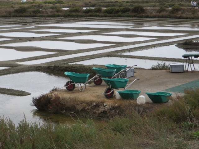 Wir sind rechtzeitig zurück zur Führung und die 1 1/2 Stunden sind vor allem dank des „Guide“ zu schnell vorbei. Wir haben zwar nicht alles verstanden, aber erfahren dass es Pflanzen gibt, die sich durch Einlagern von Salz gegen die Auswirkungen der Osmose schützen und daher extrem salzig schmecken und dass es eine Pflanze aus der Familie des Fenchels gibt, deren schwarze Samen auch als sehr aromatischer Pfeffer genutzt werden kann – unserem Guide ist es aber unverständlich warum dies nicht getan wird. Auch über die verschiedenen Arten des gewonnenen Salzes lernen wir etwas und daß das „Fleur de Sel“ nur von Frauen „gepflückt“ wird. Ein „Paludier“ (Salzbauer) kann an einem guten Tag die unvorstellbare Menge von einer Tonne Salz aus den Feldern holen. Regnen darf es dann aber nicht, jeder Zentimeter Niederschlag verringert den Ertrag um einiges.