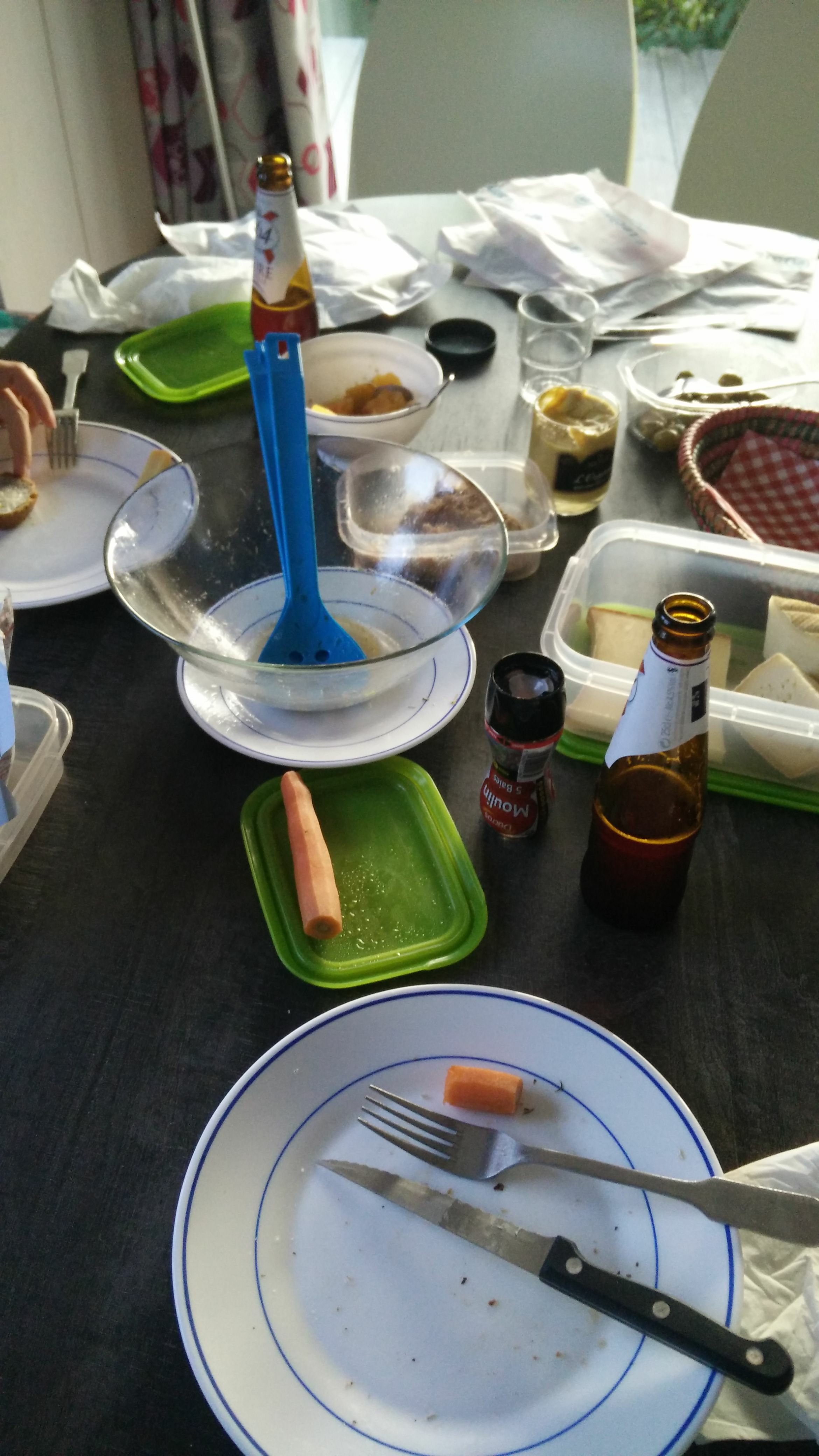 Den Abschluss des gestrigen Tages bildet ein gemütliches Abendessen in unserer Hütte, zum Draußensitzen ist es uns zu kalt. Da der Weißwein erst noch kalt werden muss gibt es zum Brot mit gesalzener Butter (lecker) Panaché mit Mûre und Myrtille – auch lecker!