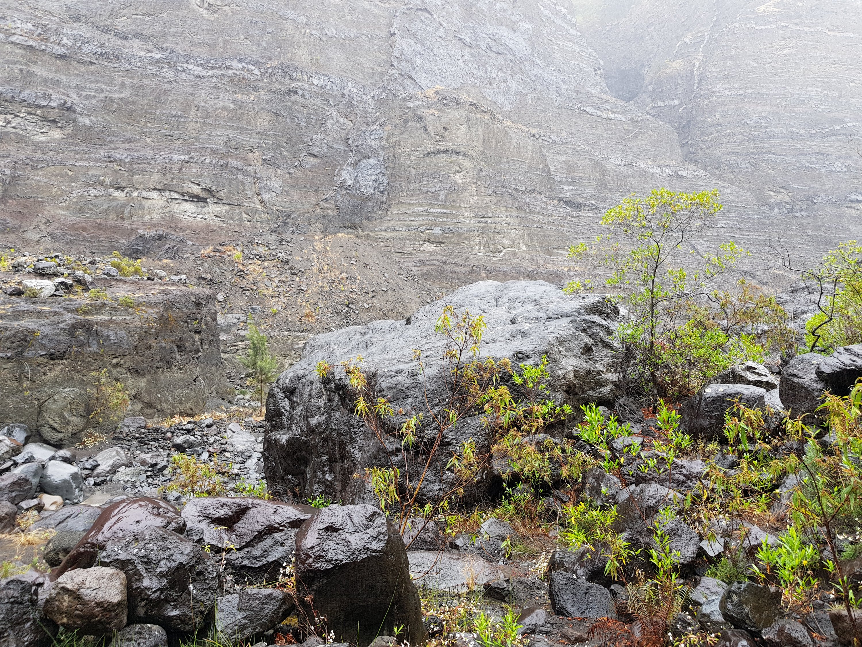 Heute ist der zweite Tag unserer 3-Tages-Wanderung in der sogenannten Mafate. Los ging es von unserer Unterkunft in Roche Plate bei gutem Wander-Wetter – nicht zu heiß, nicht zu kalt und kein Regen. Die Tour führt uns über Trois Roche bis nach Marlat. Kurz vor Trois Roche gibt es einen kleinen Kiosk der von Freunden von unserer Führerin bewirtet wird. Dort gibt es für jeden einen leckeren Crêpe (Sabine hat mich gerade nochmal darauf hingewiesen, dass ihr Crêpe mit selbstgemachtem Honig war und dass ich das unbedingt hier erwähnen soll…) und ein Becher frische Zitronenlimonade. Sabine und ich trinken dann noch einen Tee um uns ein wenig aufzuwärmen. Wir haben nämlich auf dem Weg schon ein paar Tropfen abbekommen. Während wir dort sitzen fängt es dann richtig an zu regnen.Trois Roches ist ein ziemlich beeindruckender Wasserfall. Oben ein relativ flaches Areal, aber an der Kante geht es dann ca. 50 m senkrecht nach unten. Für alle, die kein Französisch können: der Ort heißt „3 Steine“. Ich habe mal angefangen nachzuzählen, es sind mehr als drei Steine – eins, zwei, drei, viele ?…Es regnet weiter und langsam wird es ungemütlich. Nass ist sowieso schon alles, aber inzwischen geht die Nässe bis auf die Haut und es sieht ganz und gar nicht danach aus als ob es in nächster Zeit aufhören wollte. Um es kurz zu machen: es hört auch nicht mehr auf und bis wir in unserer Unterkunft für die Nacht ankommen ist trotz Regenjacke alles durch und durch nass – selbst die Jacke. Auch die Regenhülle des Rucksacks hat der Dauerberegnung nicht standgehalten uns so sind auch die Sachen im Rucksack etwas feucht…Hoffentlich hört es nachher ein wenig auf, das Essen gibt es in einer, ca. 15 min entfernten Hütte…