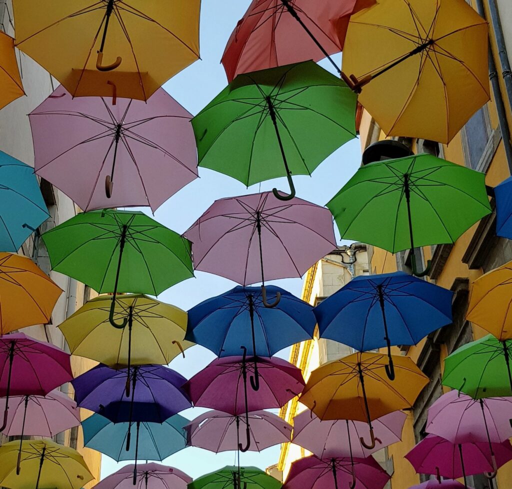 Am Nachmittag sind wir dann noch ein bisschen durch die Bastide, die „neuere“ Altstadt geschlendert. Dort sind einige Straßen als Fußgängerzonen ausgewiesen und mit Schirmen „überdacht: