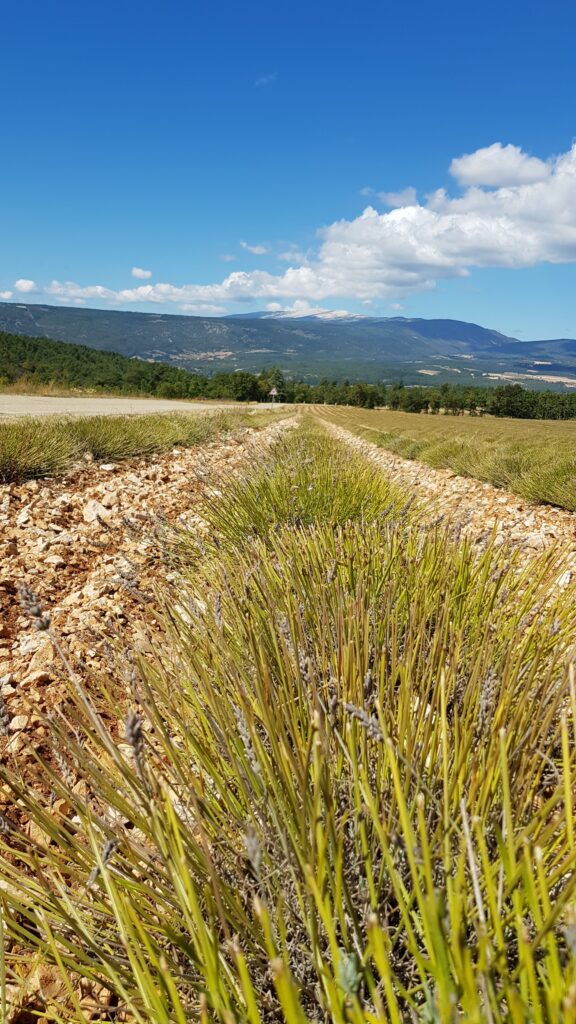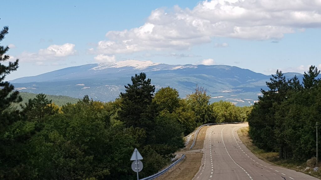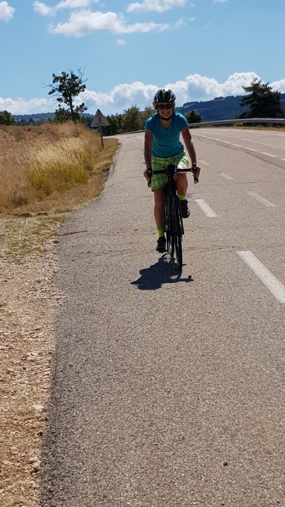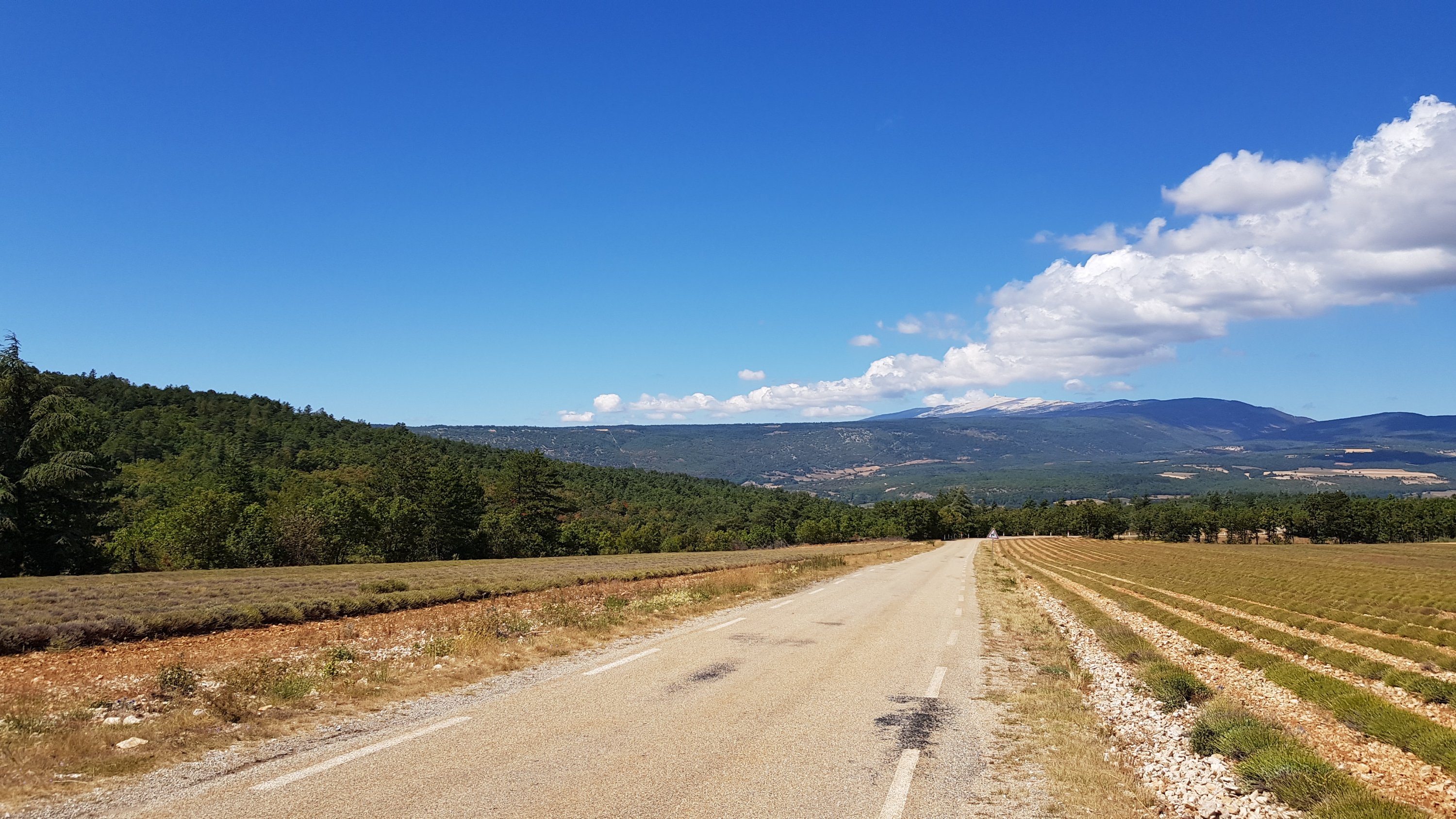 Nach einem kurzem Gang über den Markt schnallen wir die Räder ab und machen uns auf den Weg. Es geht erst ein paar Kilometer ohne große Steigungen auf einer zum Glück nicht allzu stark befahrenen Départementale (D942) entlang. In Aurel biegen wir auf die D95 ab und da geht’s dann erst mal ordentlich hoch. Über Saint-Trinit geht es in stetem auf und ab bis nach Saint Christol d’Albion. Dort genehmigen wir uns einen P’tit Café bevor wir uns an den Schlussaufstieg wagen.