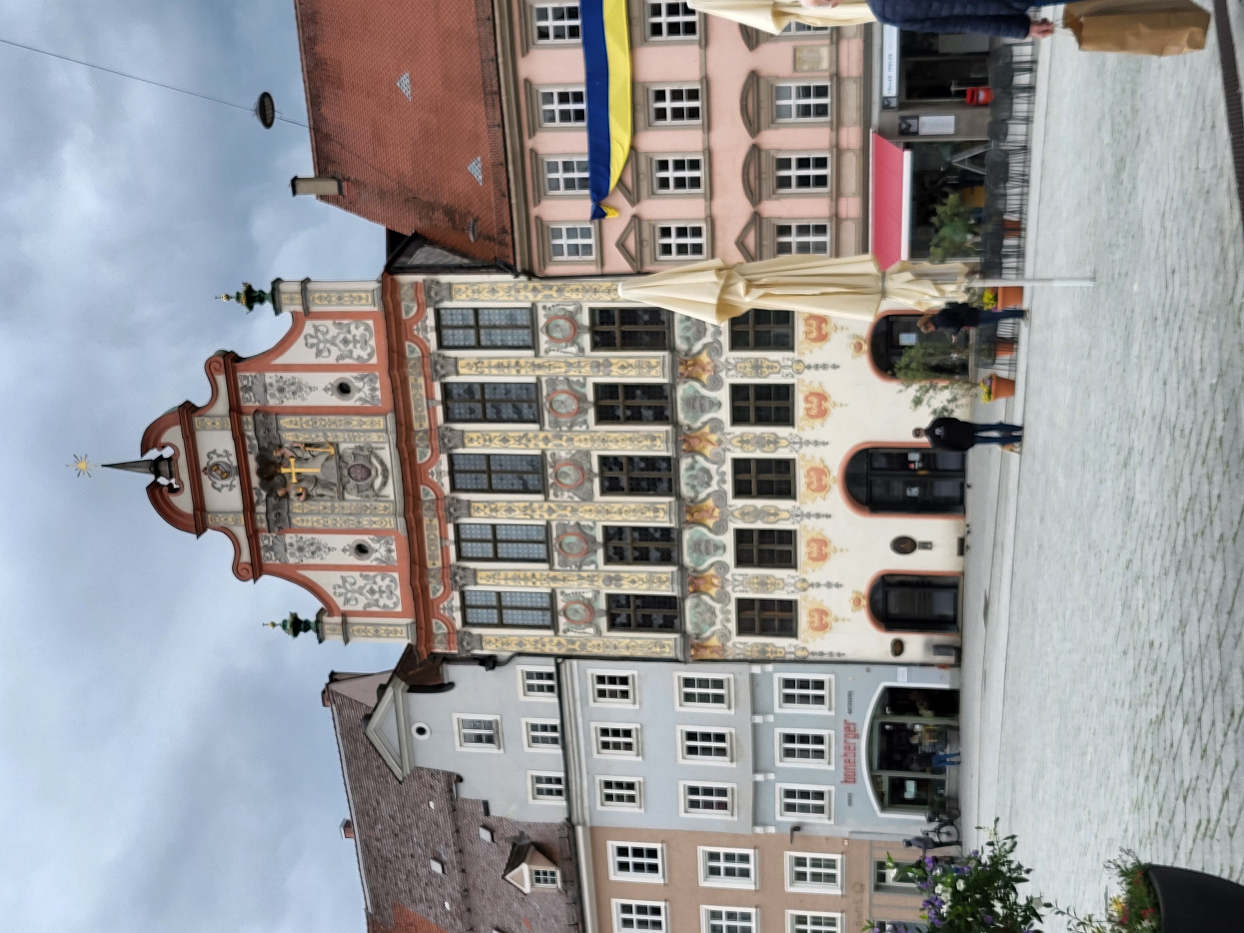 In Landsberg am Lech gab es dann noch einen sehr leckeren Kaffee und dazu einen Rhabarber-Pudding Kuchen für Sabine und eine Nussecke für mich. Landsberg ist wie eigentlich fast alle Orte auf unserem Weg heute sehr schön. In den Orten sind die Häuser meist schön renoviert und teilweise bunt bemalt.
