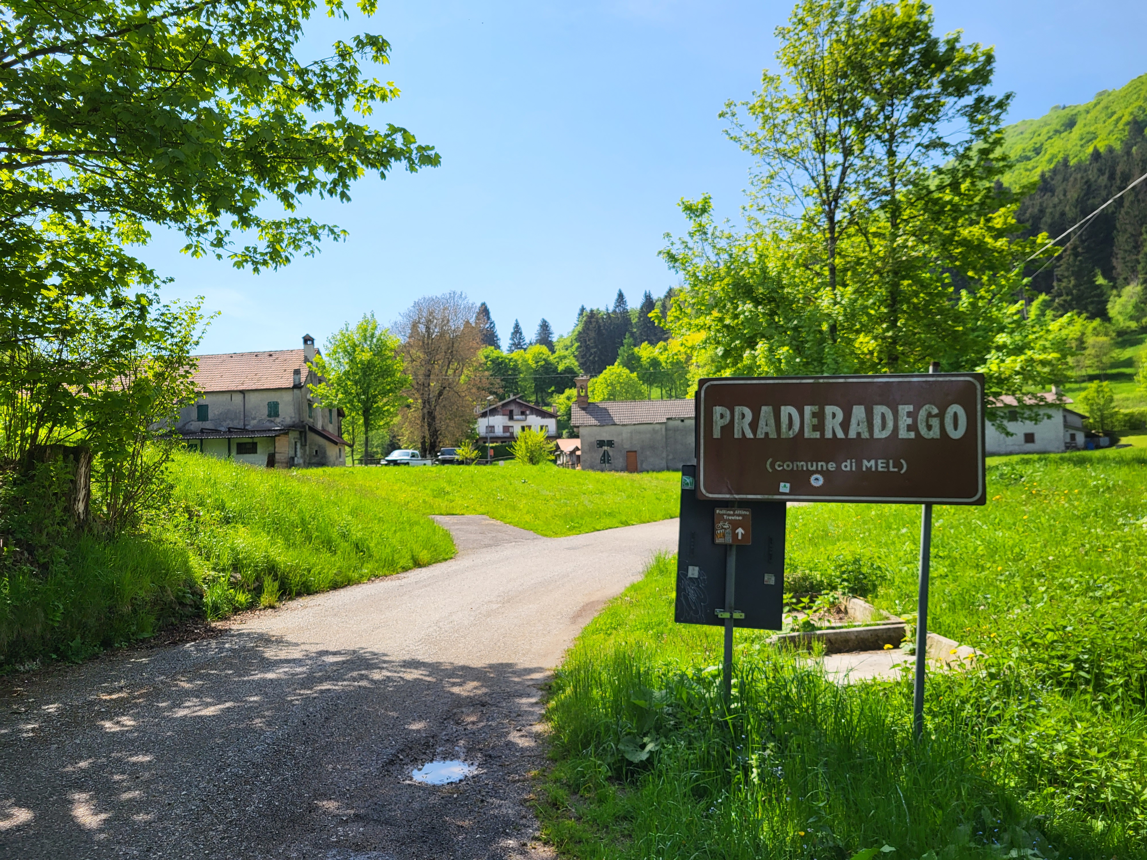 Auch wenn es früh morgens noch nicht so aussah, das Wetter sollte über den Tag besser werden und nach der Überquerung des Passes hatten wir auf Sonne gehofft. Bis oben sollte es zumindest bitte nicht regnen. Es ging heute über den Praderadego-Pass (910 m) und nach ein wenig auf und ab ging es dann auch gleich zur Sache. Der Radcomputer zeigt Orange und Rote Steigungen an – das versuchen wir mit unserem Gepäck erst gar nicht zu fahren, sondern schieben unsere Räder. Auf dem Weg nach oben kommen ein paar Rennradfahrer an uns vorbei und auch die müssen bei diesen Steigungen ganz schön kämpfen.