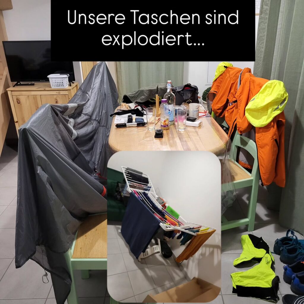 Zum Glück hatten wir uns gestern Abend schon eine Unterkunft gebucht. Da am Montag in Frankreich die meisten Restaurants geschlossen haben brauchten wir eine Alternative für unser Abendessen. Mit Hilfe von Google-Maps war schnell ein Supermarkt gefunden, für den wir keinen zu großen Umweg fahren müssen. Nur die Topographie habe ich nicht berücksichtigt, außerdem verlief der Weg über eine Departmentale (Bundesstraße) und dass zum Feierabend Verkehr. Nach den unerwarteten Höhenmetern und einigen Flüchen gegen die mit viel zu wenig Abstand überholenden Franzosen haben wir unsere Unterkunft erreicht. Warme Dusche, Essen, und dann Zelt auspacken damit es trocknen kann…