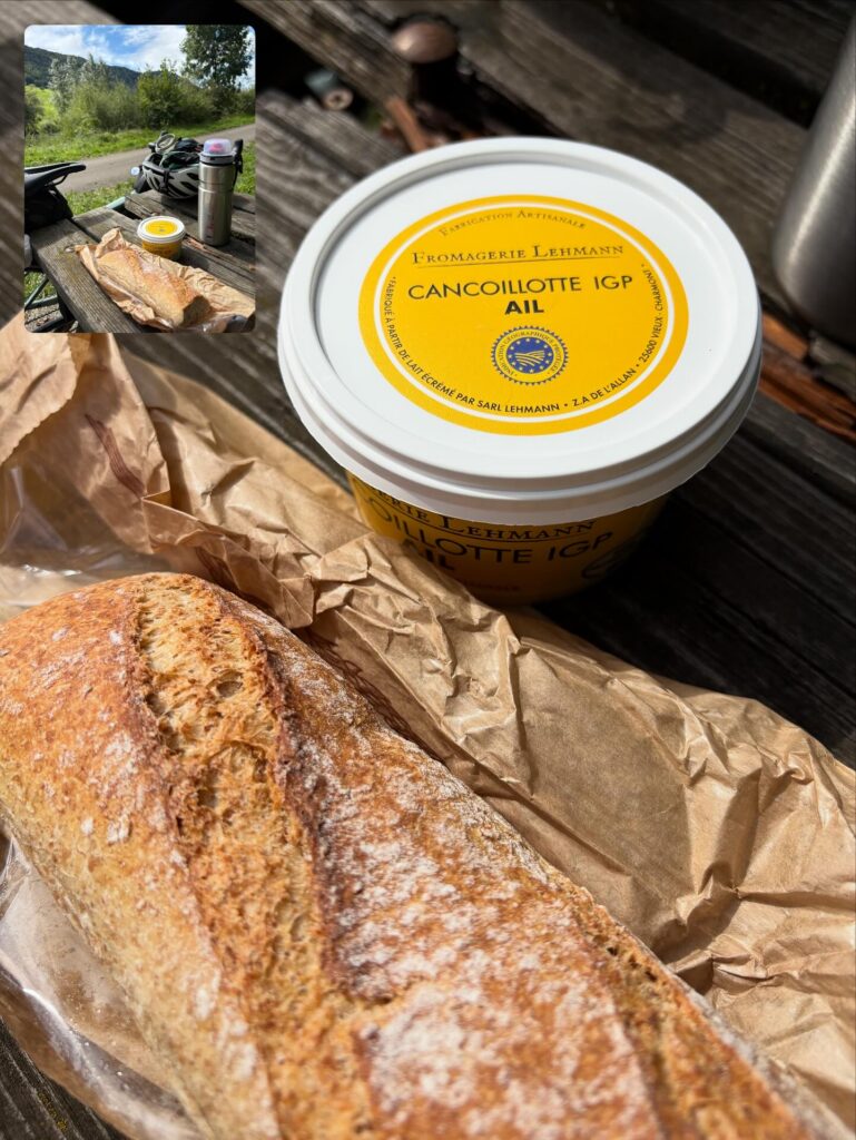 In der Nacht hat es mehrmals geregnet und auch morgens nach dem Aufstehen hat es leider wieder geregnet. Also haben wir ein nasses Zelt eingepackt, unsere Regensachen angezogen und haben uns auf den Weg gemacht. Zuerst zu einem nahen Supermarkt zum Frühstücken. Dabei haben wir @lo_et_jean_les_vagabonds kennen gelernt und uns nett unterhalten. Von den beiden haben wir den Tip bekommen die regionale Käsespezialität „Concoillotte“ zu probieren. Also haben wir diese für unsere Mittagspause eingepackt.