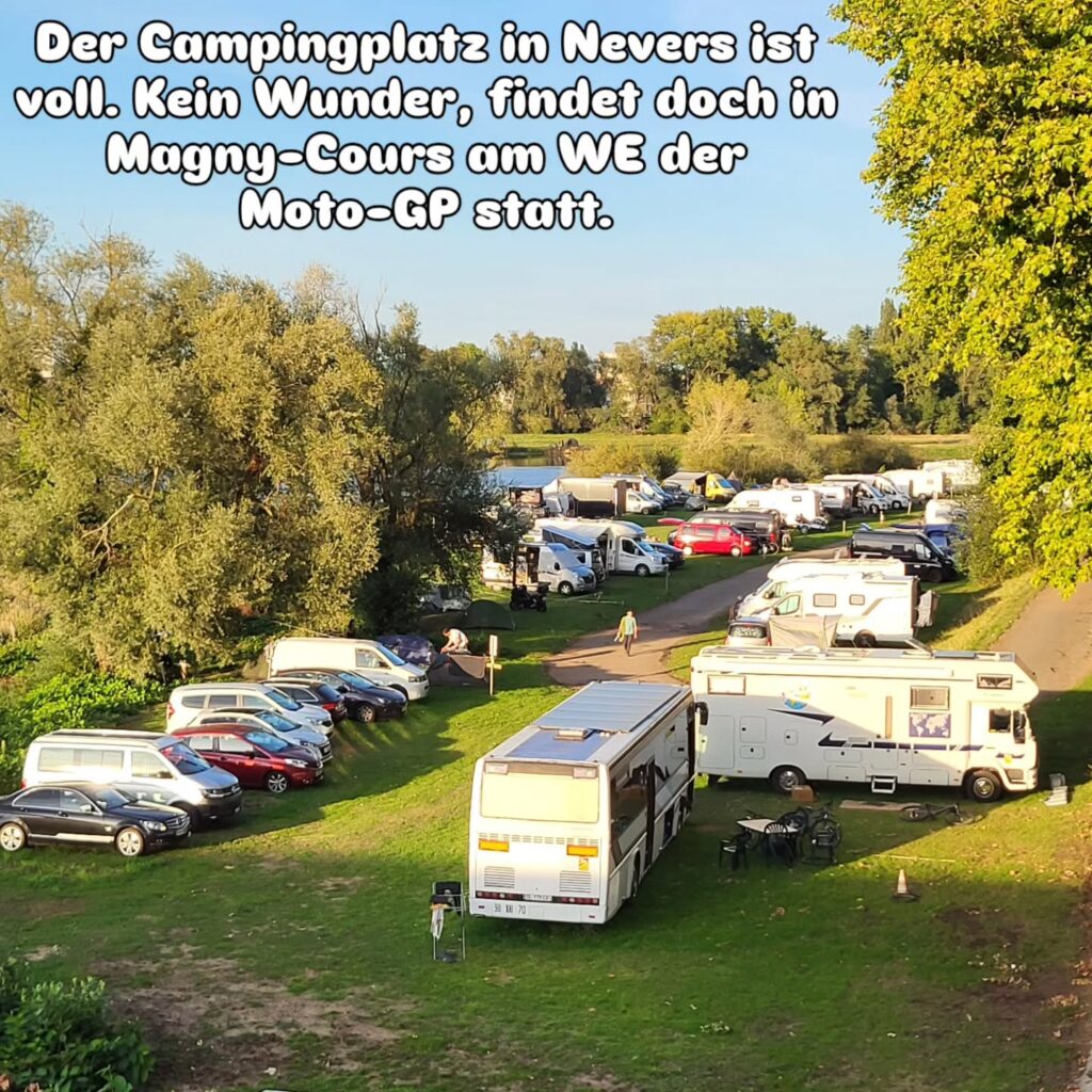 Unsere Mittagspause besteht aus einem Picknick an einer der vielen Schleusen. Ein vorbeifahrendes Paar – er auf einem Gravelbike im Bikepacking-Style, sie auf einem E-Bike im klassischen Setup – erzählen uns, dass sie in Nevers kein Hotelzimmer bekommen haben, weil in der Nähe am Wochenende ein Motorrad- Event stattfindet. Wie wir herausfinden ist die Rennstrecke Circuit de Nevers Magny-Cours gar nicht weit von Nevers entfernt und es findet dort am Wochenende der Moto-GP statt. Wir haben zum Glück kein Problem auf dem Campingplatz noch ein Plätzchen für unser Zelt zu bekommen. Die Motorradfans sind meist mit Wohnmobil angereist.