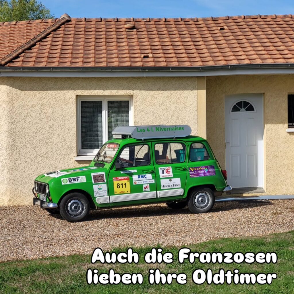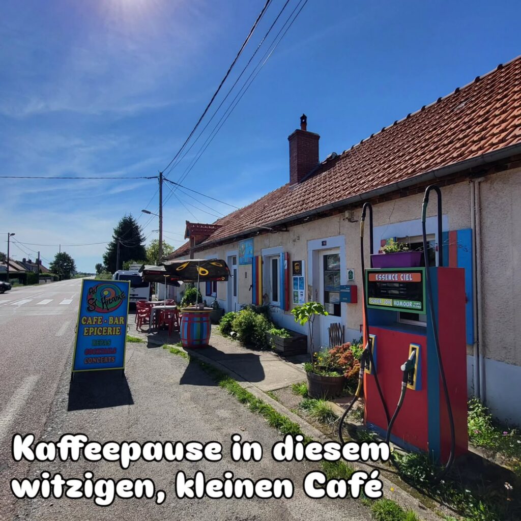 Auf dem Campingplatz haben wir keinen Kaffee bekommen, aber in weniger als 1 KM Entfernung und auf unserer Strecke gibt es ein Bar-Tabac. Dort gibt es in Frankreich meist guten Kaffee und Pain-au-Chocolat und Croissants. Frisch gestärkt und koffeiniert machen wir uns auf den Weg. Es erwarten uns zunächst ein paar Anstiege, der Weg führt ins Hinterland, weg von der Loire und von den Kanälen. Eine zweite Kaffee- und vor allem eine Toiletten-Pause machen wir in einem kleinen, witzig eingerichtetem Café. Die Gäste sind sowas von original französisch und passen eigentlich gar nicht in das farbenfroh und mit viel Liebe zum Detail eingerichtete Café.