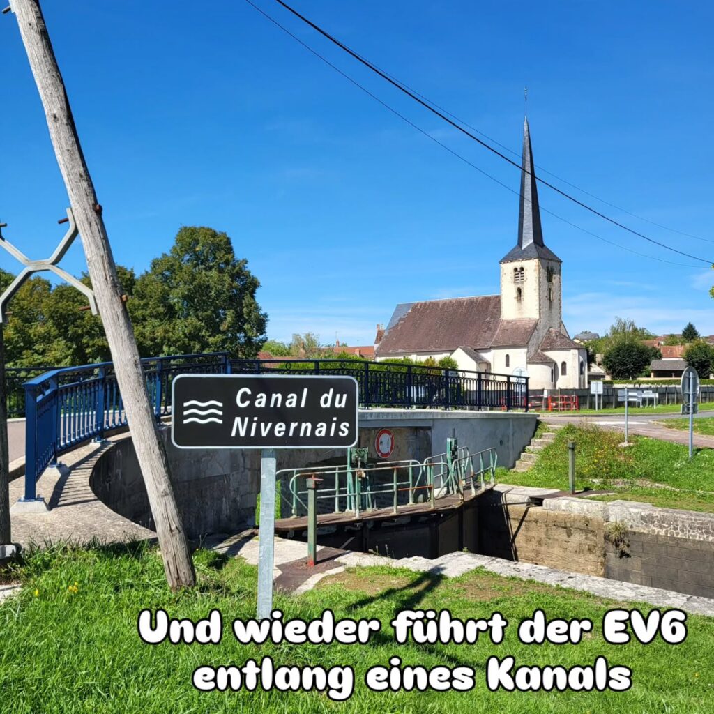 Unvermeidlich landen wir dann bald darauf doch wieder an einem Kanal. Die Madonnenstatue steht an der Schleuse an der auch das Bild mit dem Schild „Canal du Nivernais“ gemacht wurde.