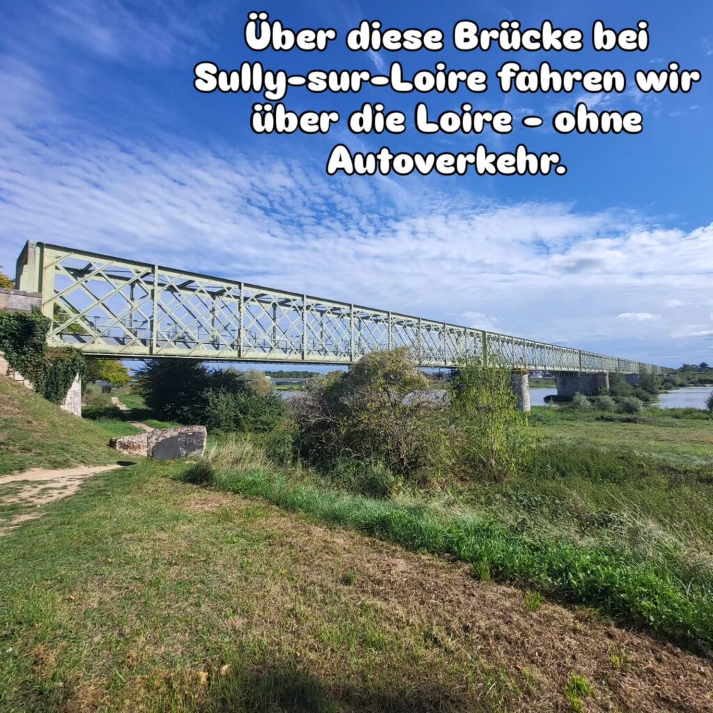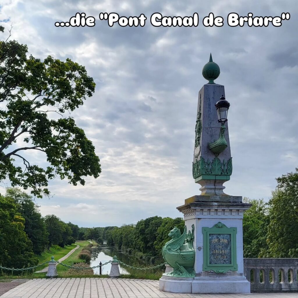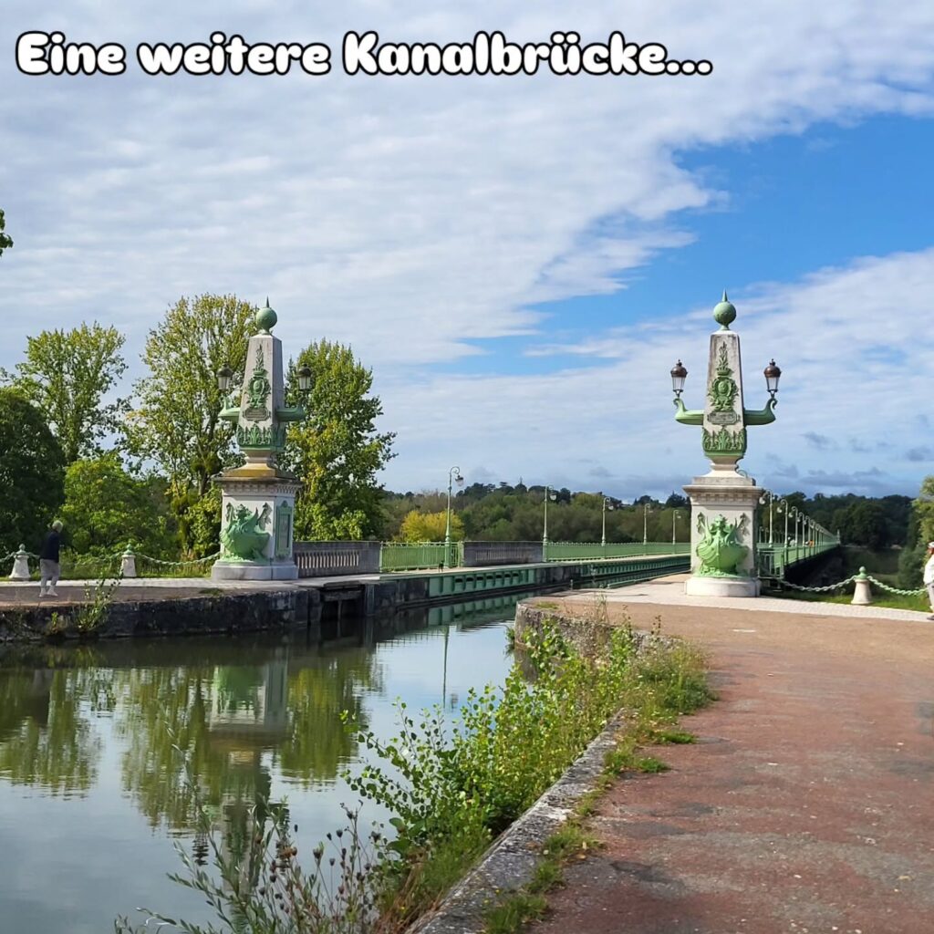 Wir treffen immer mal wieder auf den Kanal, der hier aber scheinbar nicht mehr genutzt wird. Trotzdem sind einige Schleusen wunderbar geschmückt. Die Brücke bei Châtillon-sur-Loire hat einen eigenen Fuß- und Radweg an der Seite. Auf der Kanalbrücke „Pont Canal de Briare“ geht es wieder zurück über die Loire. Die Brücke ist sehr beeindruckend und auf beiden Seiten mit großen Stelen geschmückt.