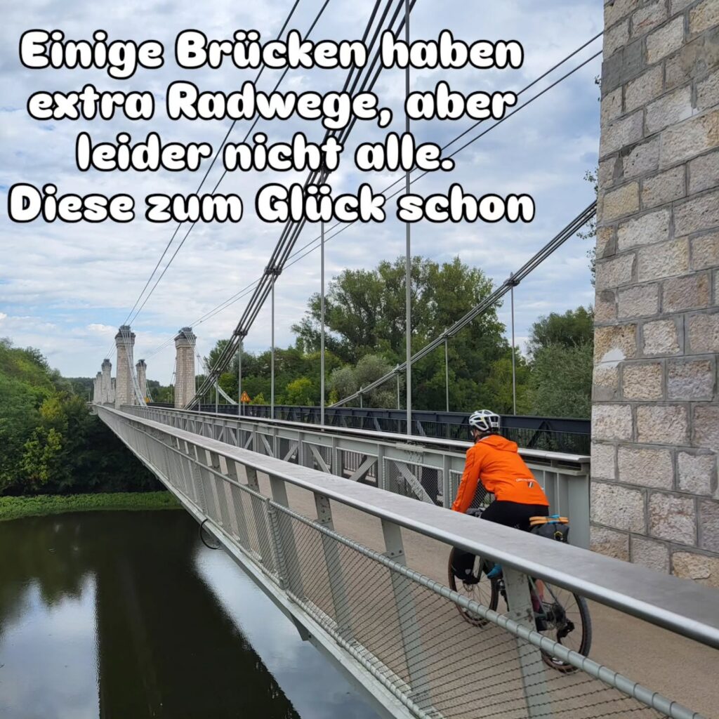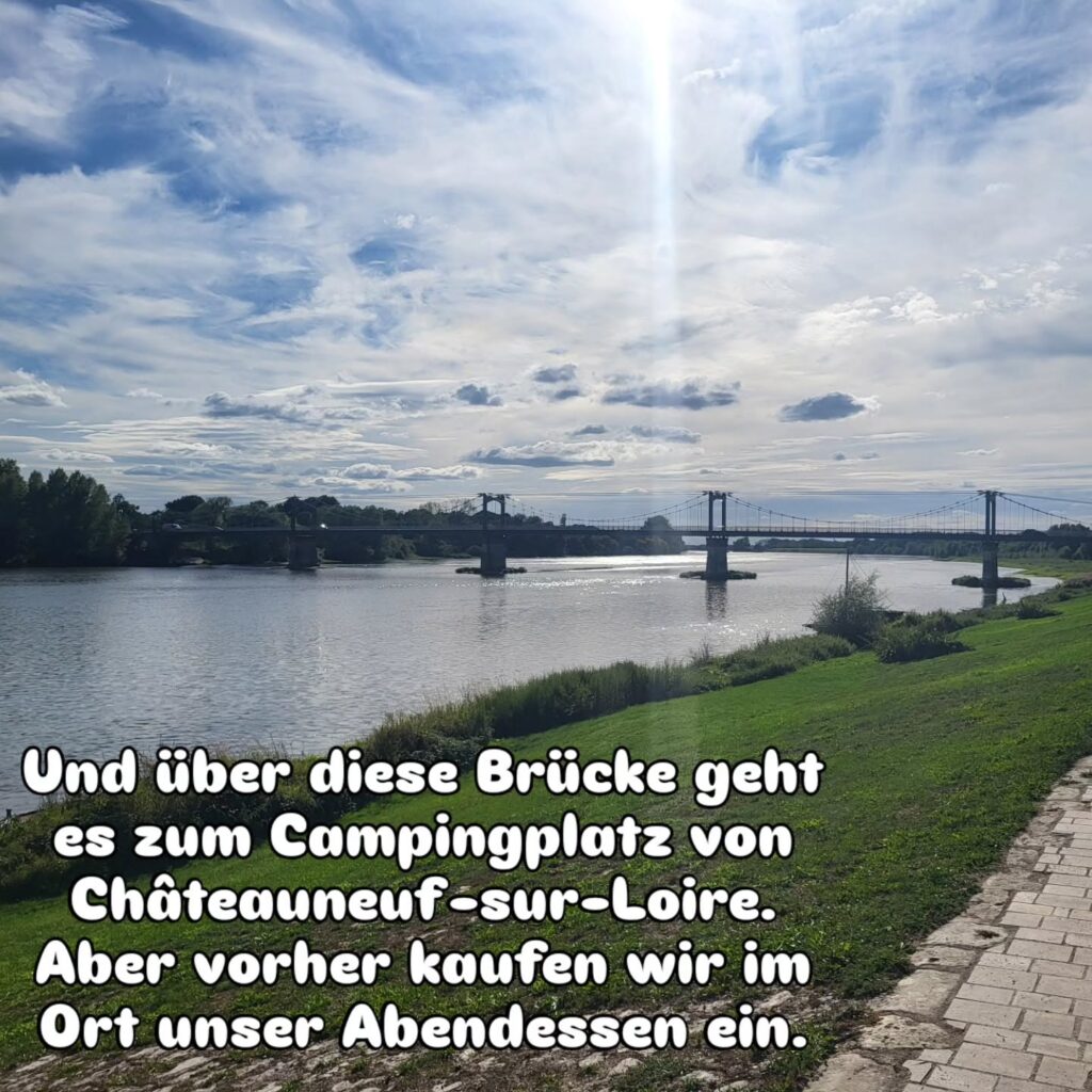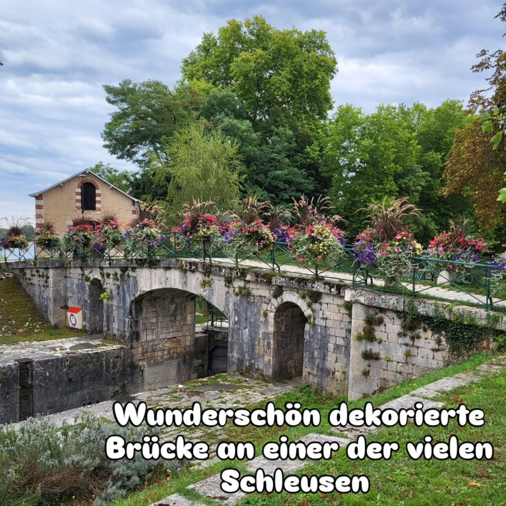 Wir treffen immer mal wieder auf den Kanal, der hier aber scheinbar nicht mehr genutzt wird. Trotzdem sind einige Schleusen wunderbar geschmückt. Die Brücke bei Châtillon-sur-Loire hat einen eigenen Fuß- und Radweg an der Seite. Auf der Kanalbrücke „Pont Canal de Briare“ geht es wieder zurück über die Loire. Die Brücke ist sehr beeindruckend und auf beiden Seiten mit großen Stelen geschmückt.