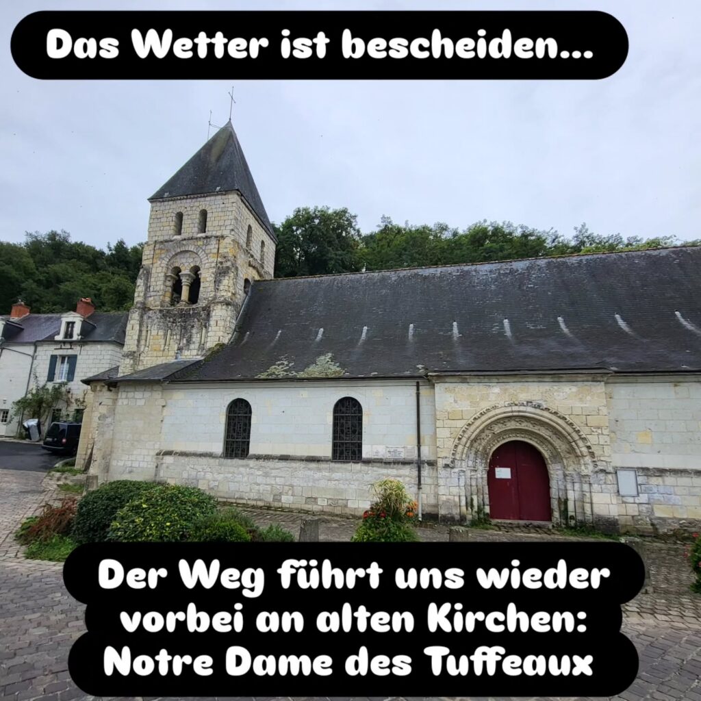 Am 13.9. geht es auf der 13. Etappe weiter von Saumur nach Montjean-sur-Loire. Morgens treffen wir Peter aus UK auf dem Markt wieder. Wir sind gerade fertig mit unserem Frühstück (unglaublich leckere Mandel-Pain-au-Chocolat) als er um die Ecke kommt. Er möchte auch erst einmal Frühstücken, daher fahren wir alleine los. Wir suchen uns unseren Weg raus aus Saumur und müssen schon den ersten Anstieg bewältigen bis wir aus Saumur raus sind. Vorbei geht es an Weinfeldern und Maisfeldern, doch bald führt uns der Weg zurück an die Loire. Wir kommen an einigen Kirchen und alten Klöstern vorbei.