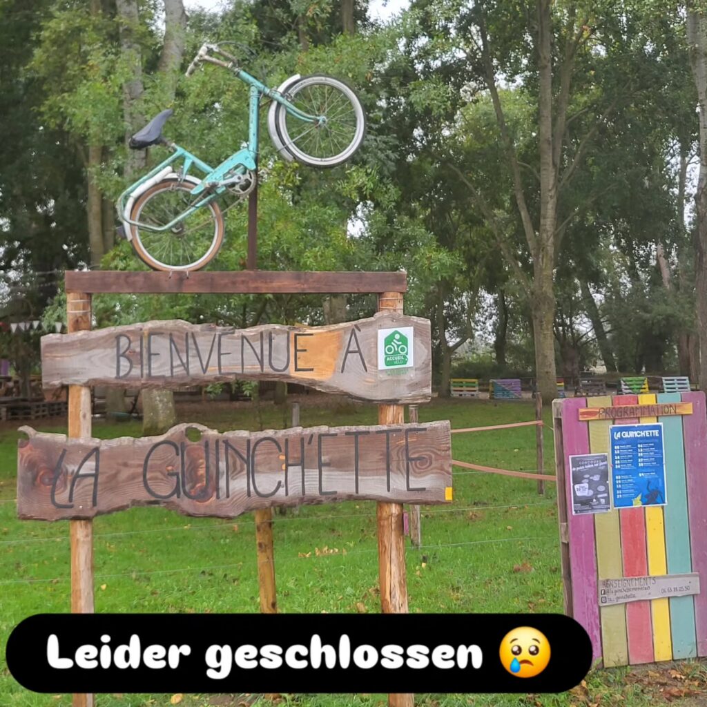 Wir haben uns für die Nacht wieder eine Gîte gemietet – es soll die ganze Nacht regnen. Die Gîte liegt über der Einfahrt zu einem Haus und wir werden vom Vermieter im Hof begrüßt. Er bietet uns an, unsere Räder mit dem Gartenschlauch sauber machen zu dürfen. Das Angebot nehmen wir gerne an, haben wir heute doch einiges an Dreck aufgesammelt. Nach den Rädern machen wir uns selber frisch und machen uns auf den Weg zur Pizzeria im Ort. Leider das einzige Restaurant im Ort, das geöffnet hat. Auf dem Weg schauen wir bei Jacques Tochter vorbei und sagen „Hallo“. Die Einladung zu einem Tee müssen wir ablehnen, da wir echt hungrig sind.