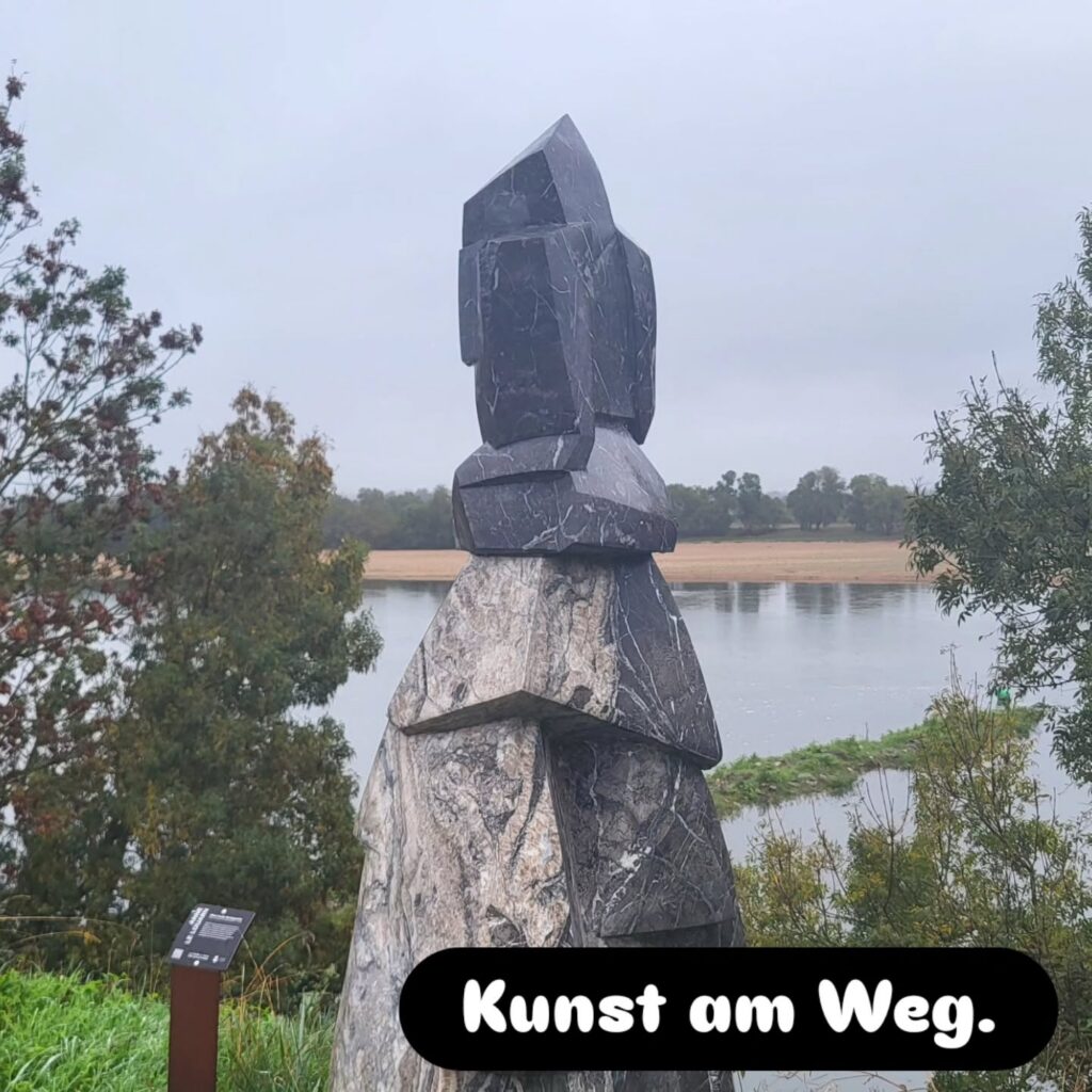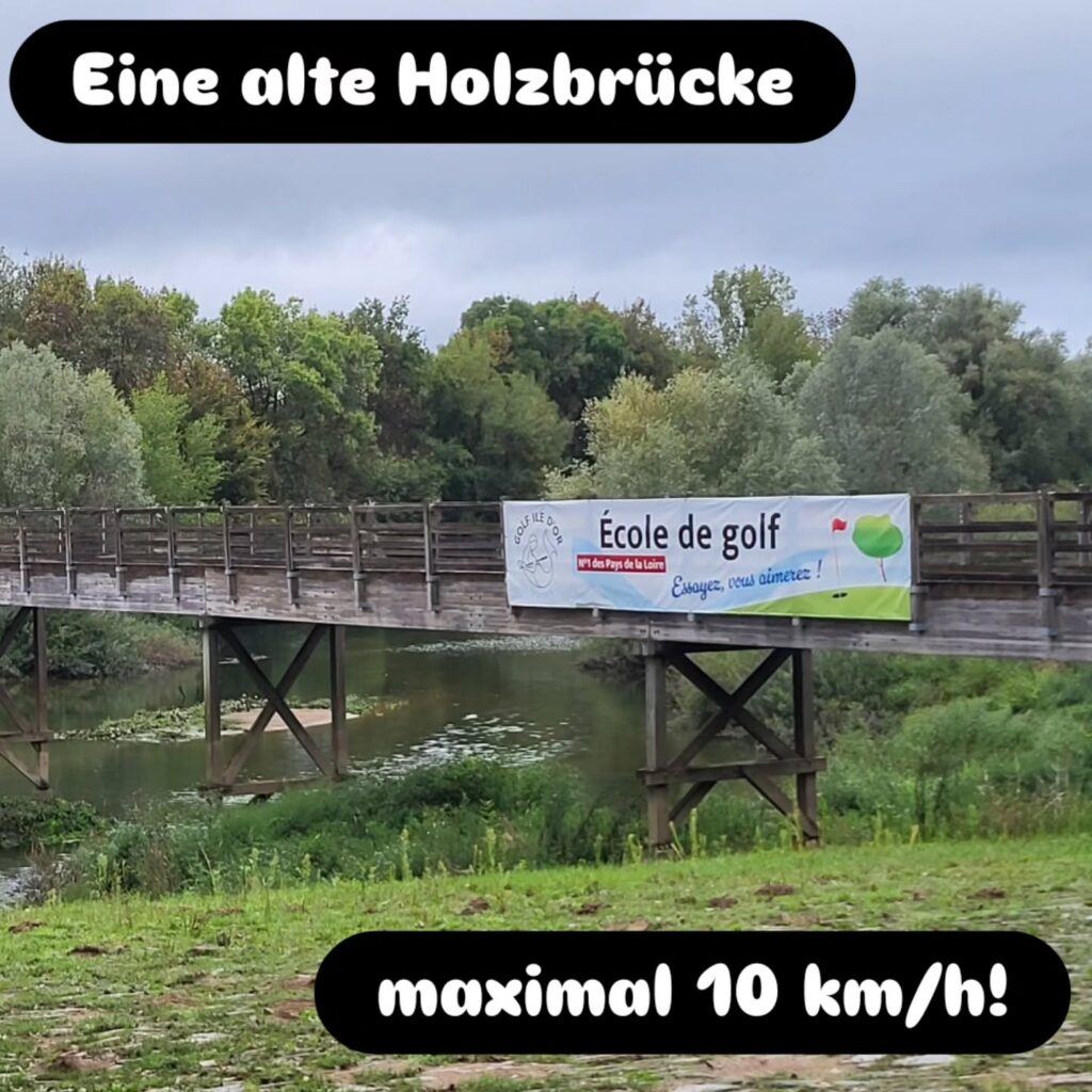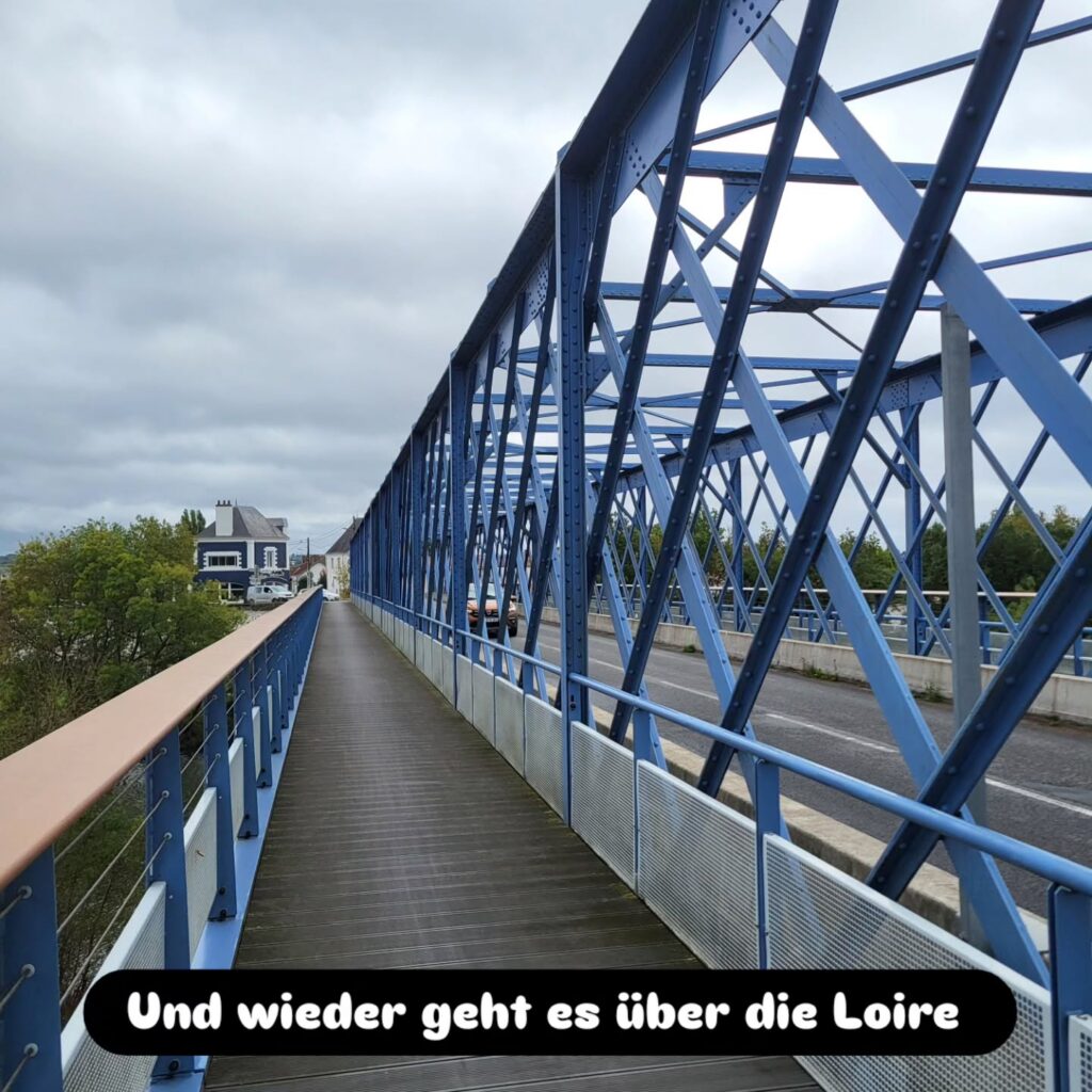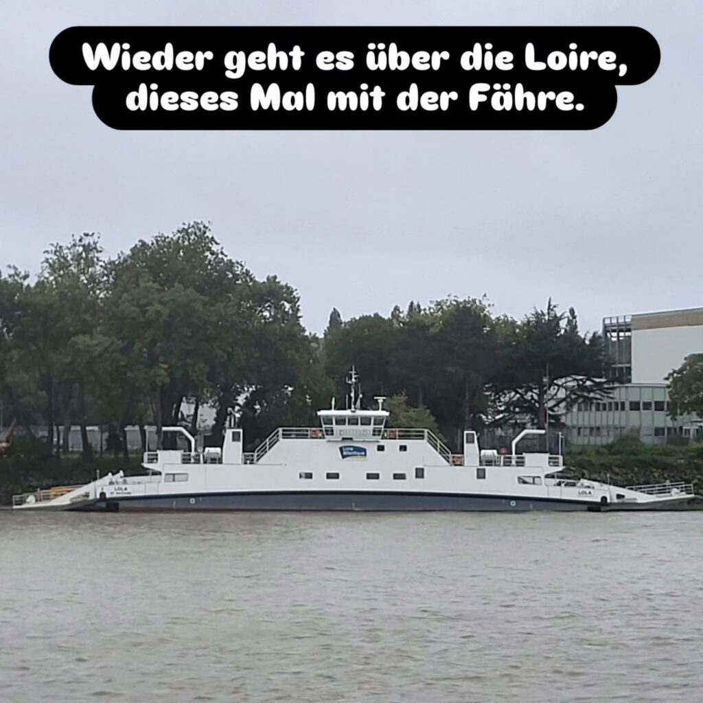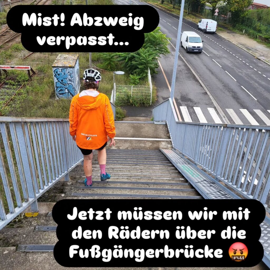Durch Nantes fahren wir durch, das Wetter lädt nicht zu einer Stadtbesichtigung ein und vielleicht kommen wir an einem der Ausruhtage noch einmal zurück in die Stadt. Aus der Stadt raus gibt es wieder viele Baustellen. In Nantes wird, wie in vielen Städten in Frankreich, die Verkehrsinfrastruktur umgebaut. Ziel ist eine Radfahrer:innen freundliche Infrastruktur. Auf einer der Umleitungsstrecken verpassen wir eine Abzweigung und müssen um wieder auf unsere Strecke zu kommen über eine Fußgängerbrücke.