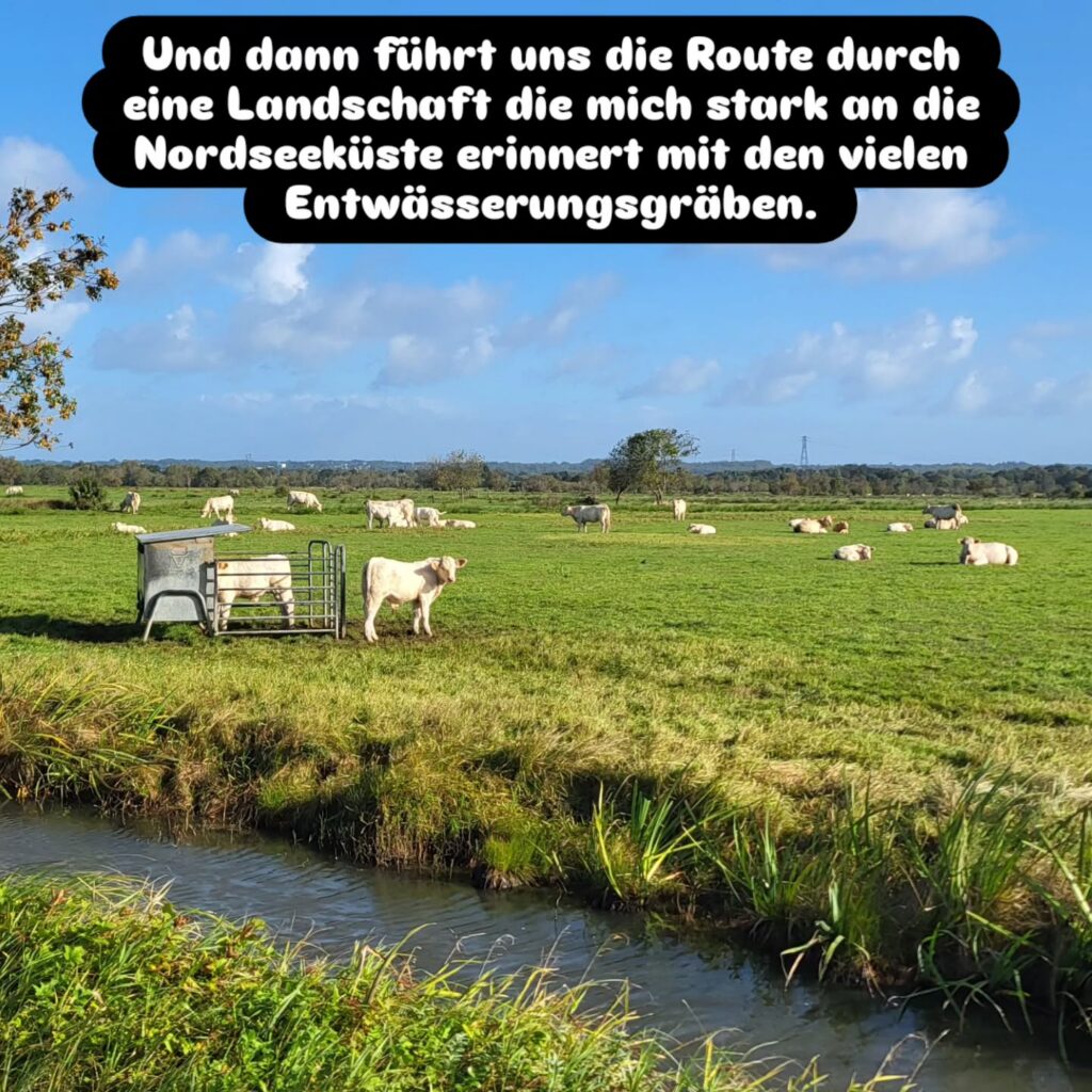 Es geht im Zick-Zack durch eine Landschaft die mich stark an Norddeutschland erinnert. Neben den Wegen und Straßen gibt es Entwässerungsgräben und auf den Wiesen stehen Kühe. Die Kühe sind hier nur nicht Schwarz-Weiß, sondern meist Weiß.